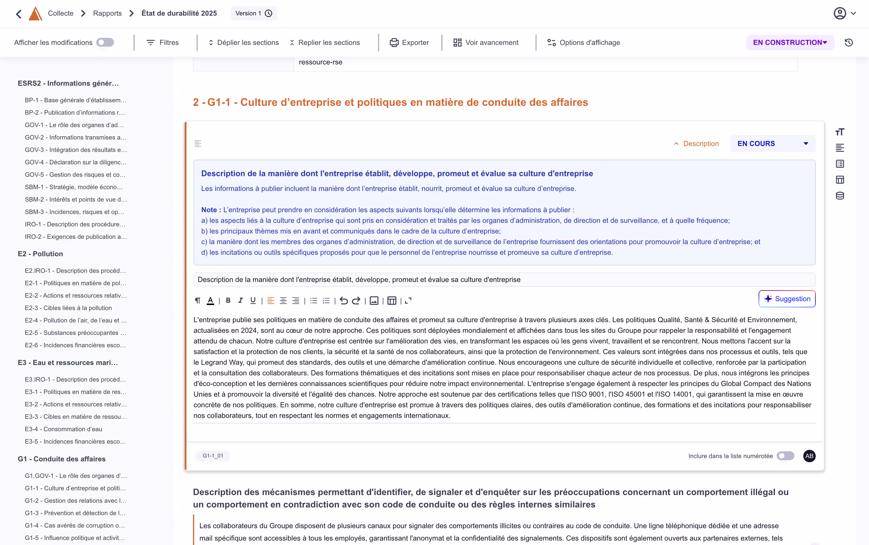 - Collaborative writing with granular permissions and validation by section (ESRS)
