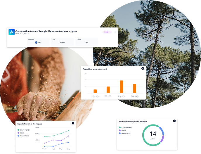Générez automatiquement tableaux, graphiques, analyses et narratifs à partir de vos données de matérialité, climat, risques ou plans d’action.