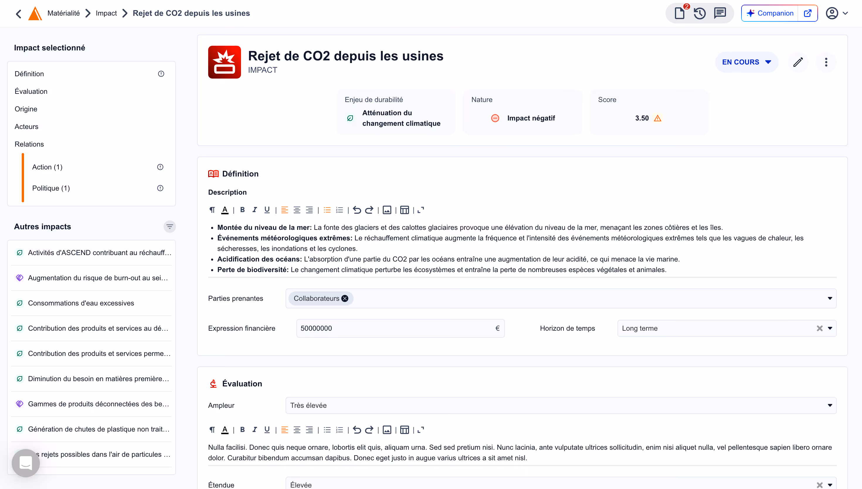 Pour chaque enjeu, Harnest permet d'identifier et d'évaluer les impacts, risques et opportunités selon les critères de la double matérialité - ampleur, étendue, irrémédiabilité, probabilité.